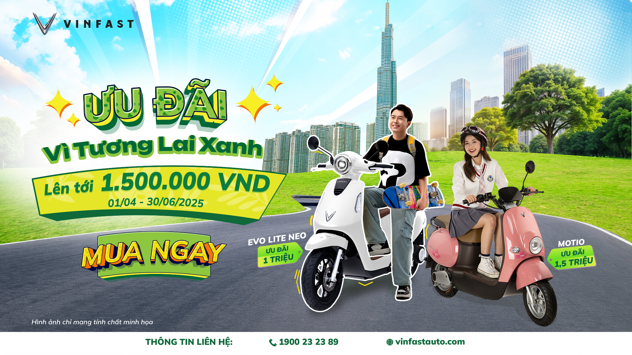 VinFast tiếp tục khẳng định vai trò tiên phong trong phong trào “Vì tương lai xanh” bằng việc chính thức phát động chiến dịch đồng hành cùng thế hệ trẻ. Chương trình mang đến ưu đãi hấp dẫn lên đến 1.500.000 đồng khi khách hàng mua xe máy điện VinFast Motio và Evo Lite Neo. Đây là bước đi mạnh mẽ của VinFast nhằm khuyến khích lối sống xanh, thúc đẩy xu hướng di chuyển bền vững và đồng hành cùng giới trẻ Việt Nam trên hành trình bảo vệ môi trường.